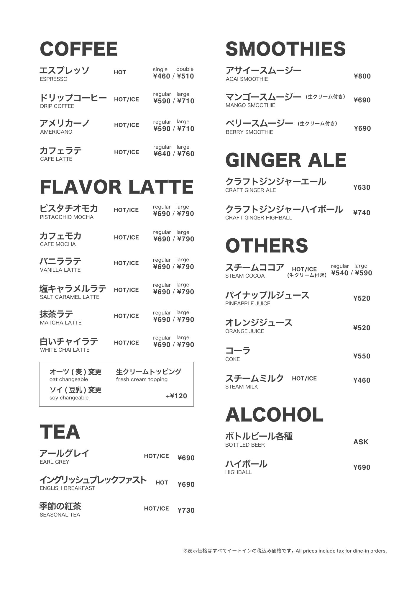 カフェラテ、アメリカーノ等のコーヒーメニューを取り揃え、紅茶・フラッペの種類も充実。様々なお客様に「ジャンルレスな楽しみ方」を体験していただけます。