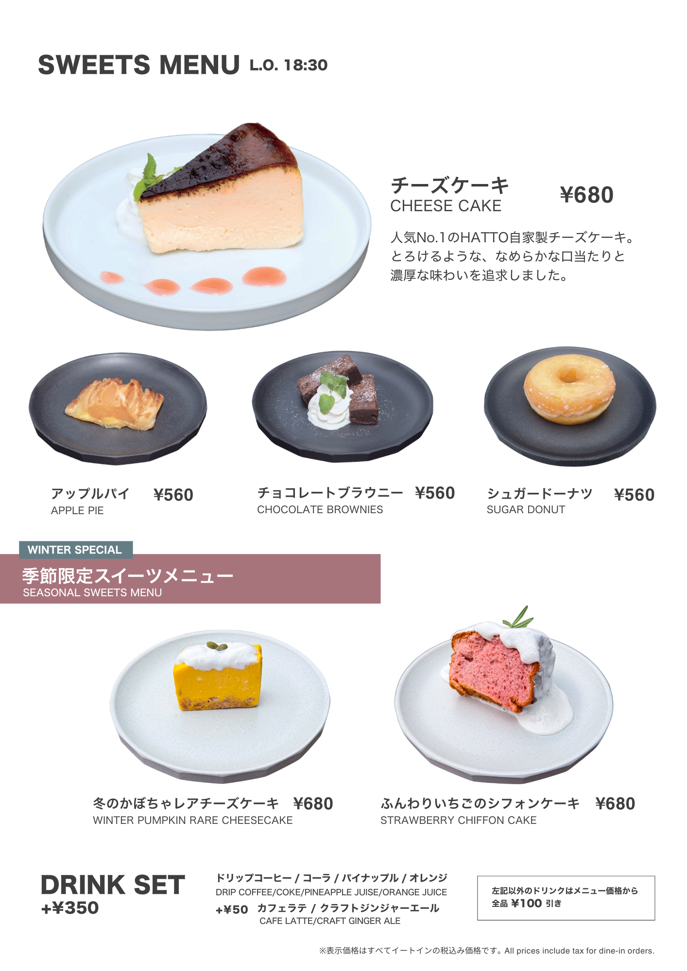 素敵な時間を過ごすための軽食やドリンク等、各種メニューをご用意。1人で過ごす時間、仲間と楽しく過ごす時間、大切な人との時間、どのようなシーンでも満足いただけるメニューを用意しています。